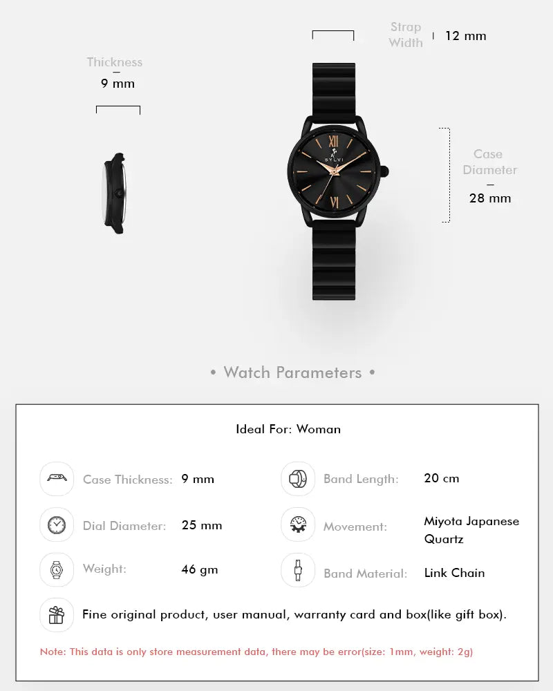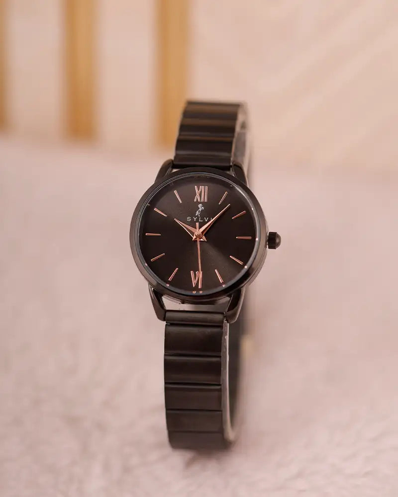 The striking all-black design with a polished stainless-steel link strap adds a luxurious vibe, making it one of the latest watches for women who prefer versatile fashion. Perfect for pairing with both casual outfits and evening wear, this black watch for women is your ultimate go-to accessory.
