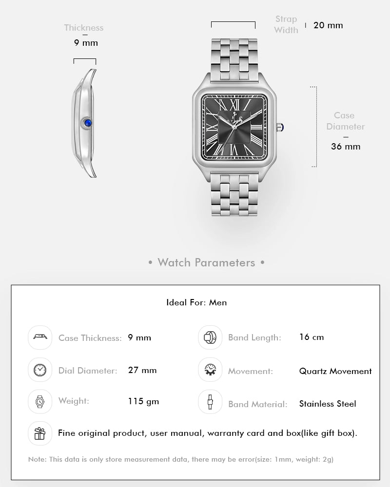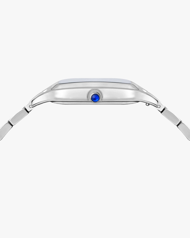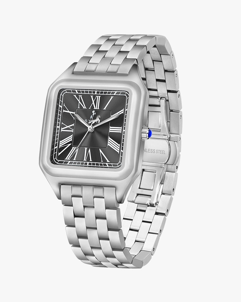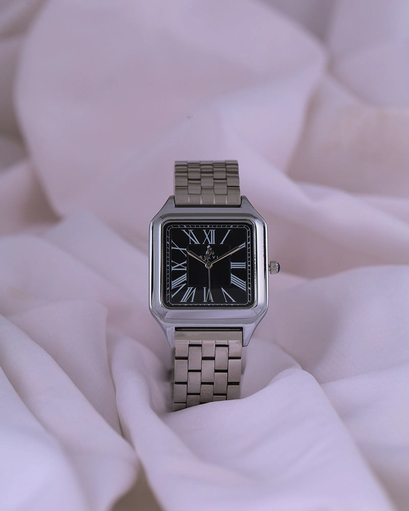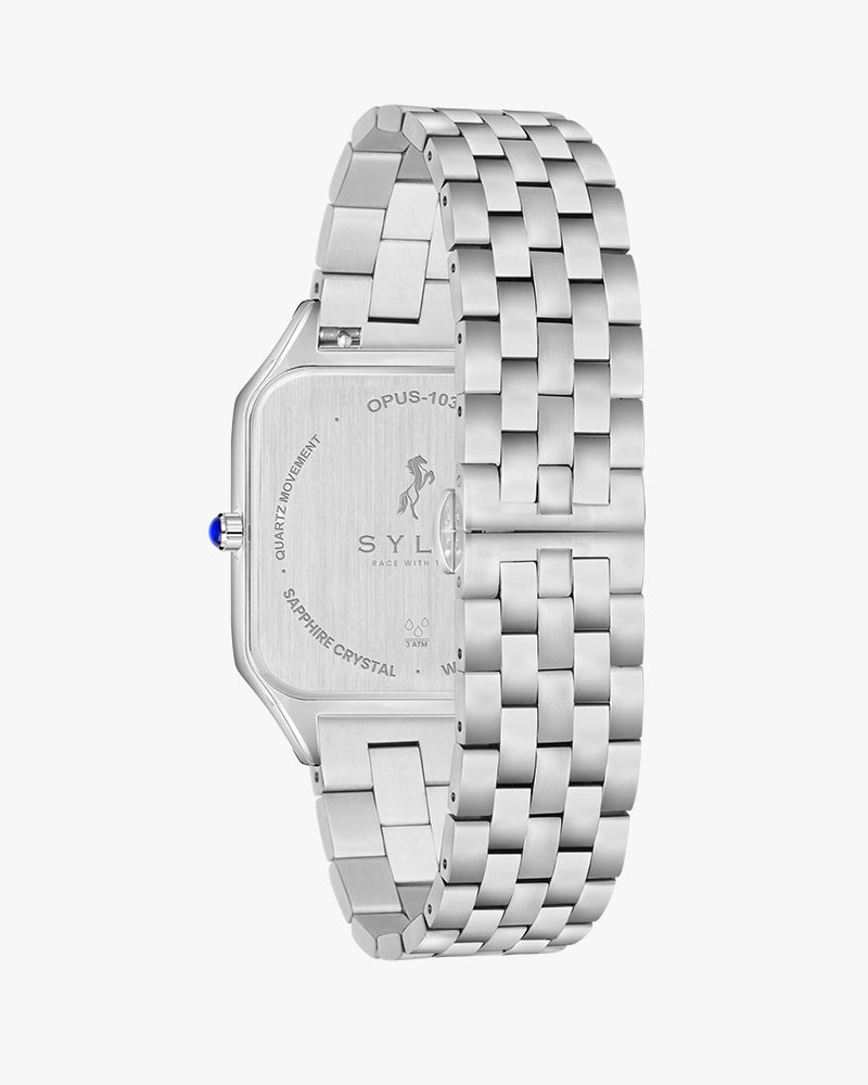 A symbol of enduring style, the Sylvi Opus features a sophisticated rectangular case and Roman numeral dial, reflecting timeless elegance. The stainless steel strap adds a modern touch, offering both comfort and durability for long-lasting wear. Powered by precise quartz movement, the Opus is as functional as it is stylish.