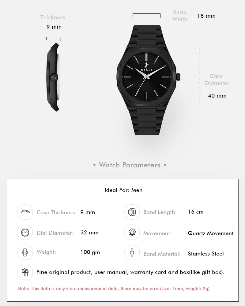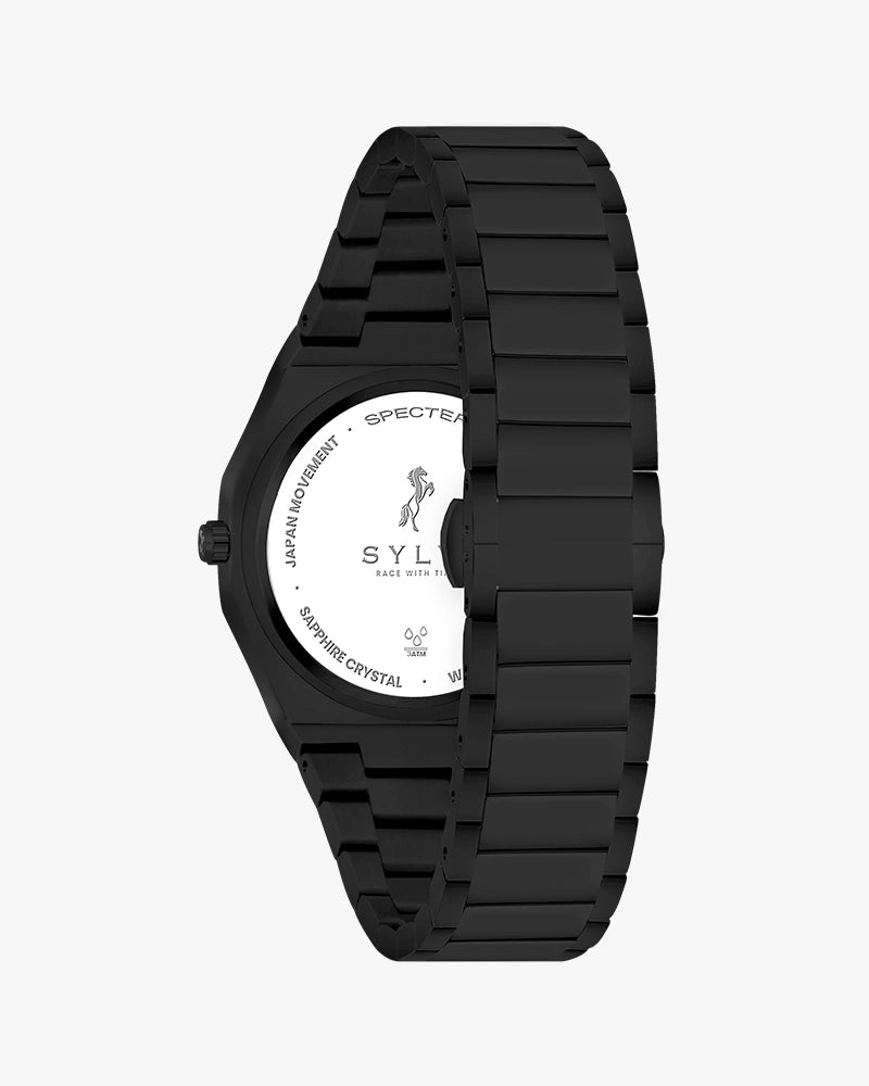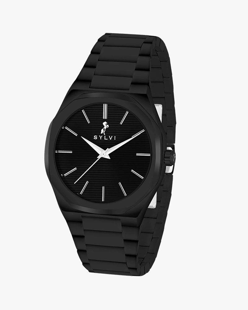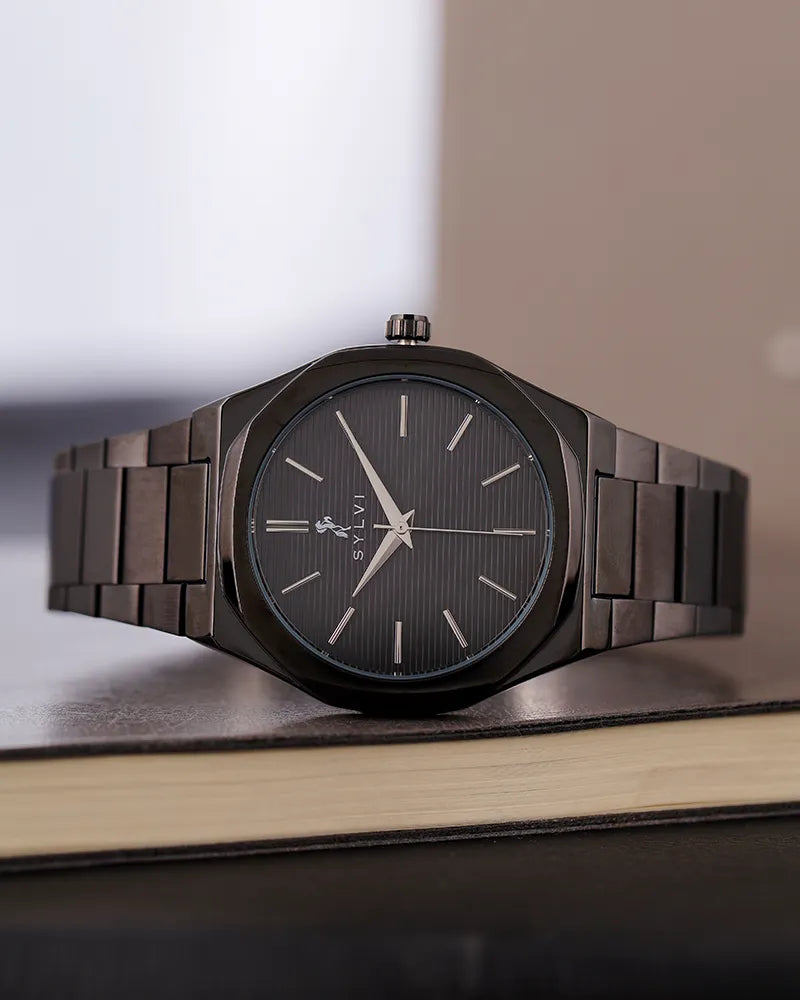The Sylvi Specter Black Steel is a statement of refined sophistication, crafted for those who appreciate a sleek and professional aesthetic. Its striking black dial, paired with an analog display, exudes minimalism while maintaining a bold presence. Precision-driven quartz movement guarantees impeccable accuracy, ensuring that every moment is measured flawlessly.