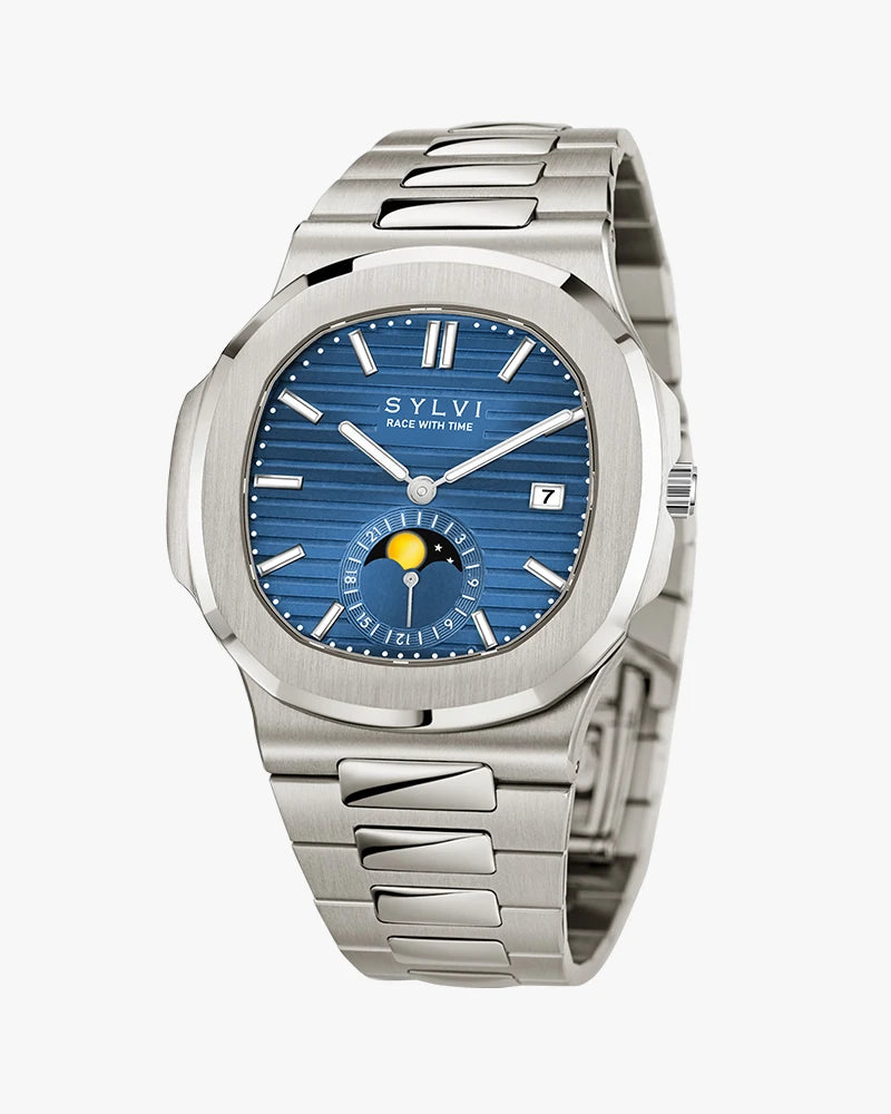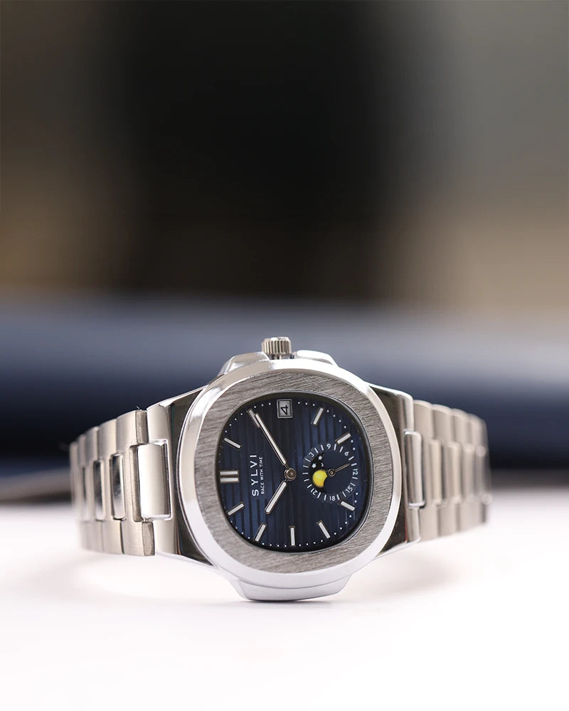 Embrace celestial charm with the Sylvi Urbane Moon Blue Silver, a timepiece designed for those who appreciate style and precision. Its squircle-shaped analog dial, inspired by the mystique of the moon, features a striking blue hue complemented by silver accents. The refined design makes it a standout accessory, while the date display adds a practical touch for everyday convenience.