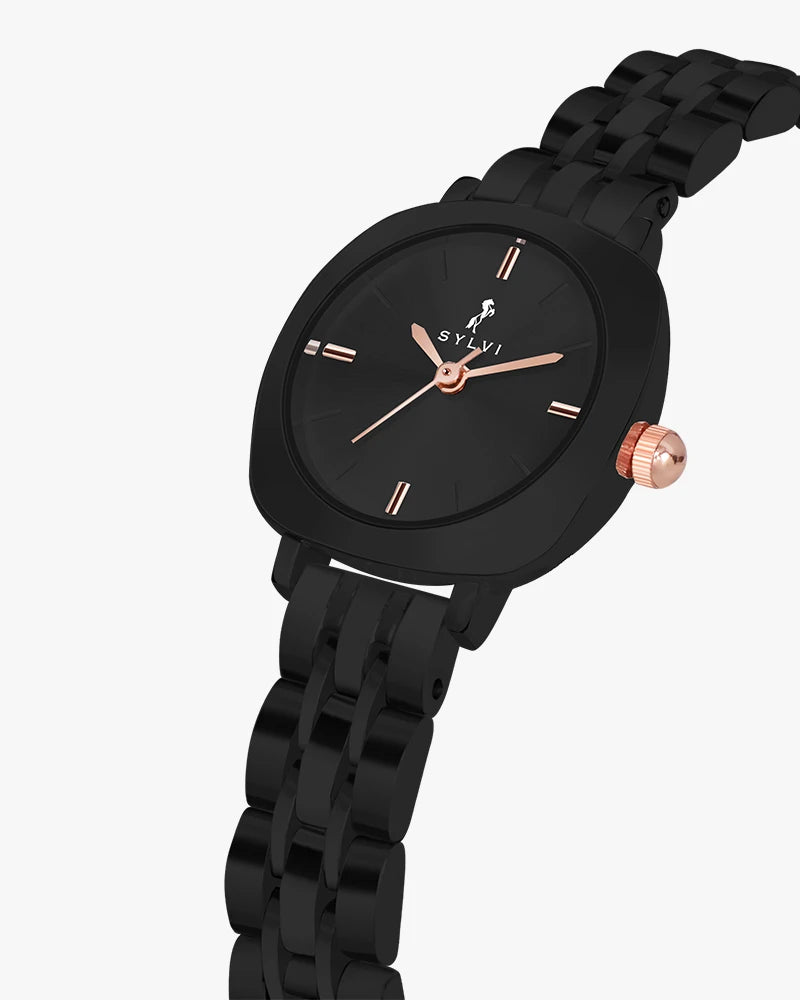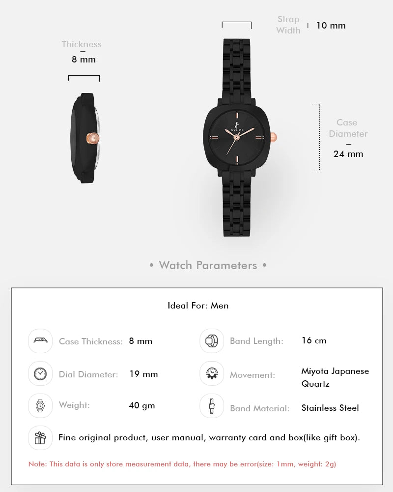 The watch features a small dial with a classic analog design, offering timeless appeal and easy readability. The glossy black dial, with a diameter of 19mm, is complemented by a fashion bezel and a unique squircle-shaped case in black tones. Crafted from durable alloy with a steel cover, the case ensures long-lasting protection while adding a refined touch to your wrist.