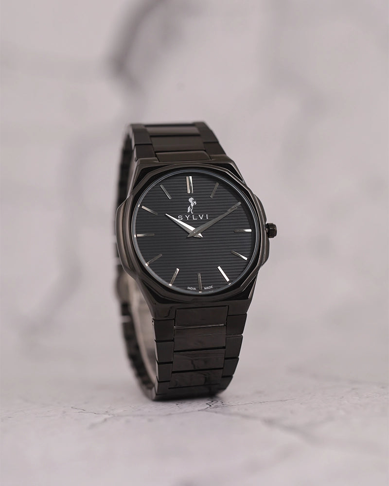 Presenting Sylvi's Blade Steel Watch – the slimmest addition to our men’s collection, crafted with pride in India. This minimalist analog watch boasts a unique octagon-shaped case, paired with a sleek black dial and a luxurious black stainless steel bracelet, offering a look that’s effortlessly sophisticated.