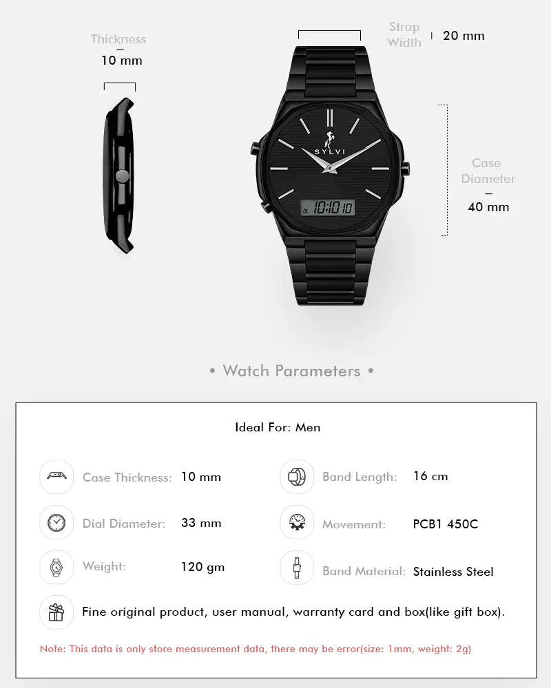 The watch is round with the Stainless steel bracelet in full black finishing that gives the watch a complete unity appearance. It is safe, stable, and comfortable to wear over long durations of time therefore it can be used at work, on the move and daily activities.