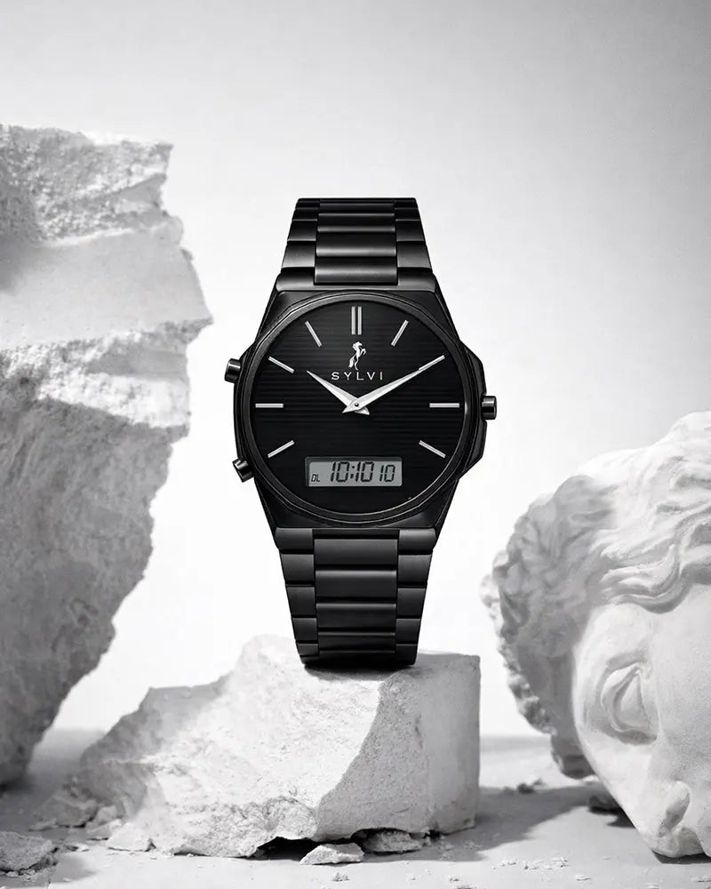 Sylvi watches are created thoughtfully, simply and responsibly. Every watch represents both the Indian artisanship and modern thinking of design, which is also premium without needless complexity. The Blade Dual Time All Black is the symbol of power, its simplicity, and the ability to perform well.