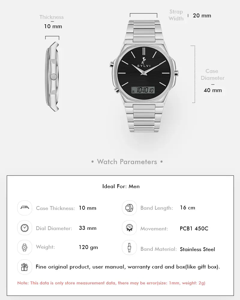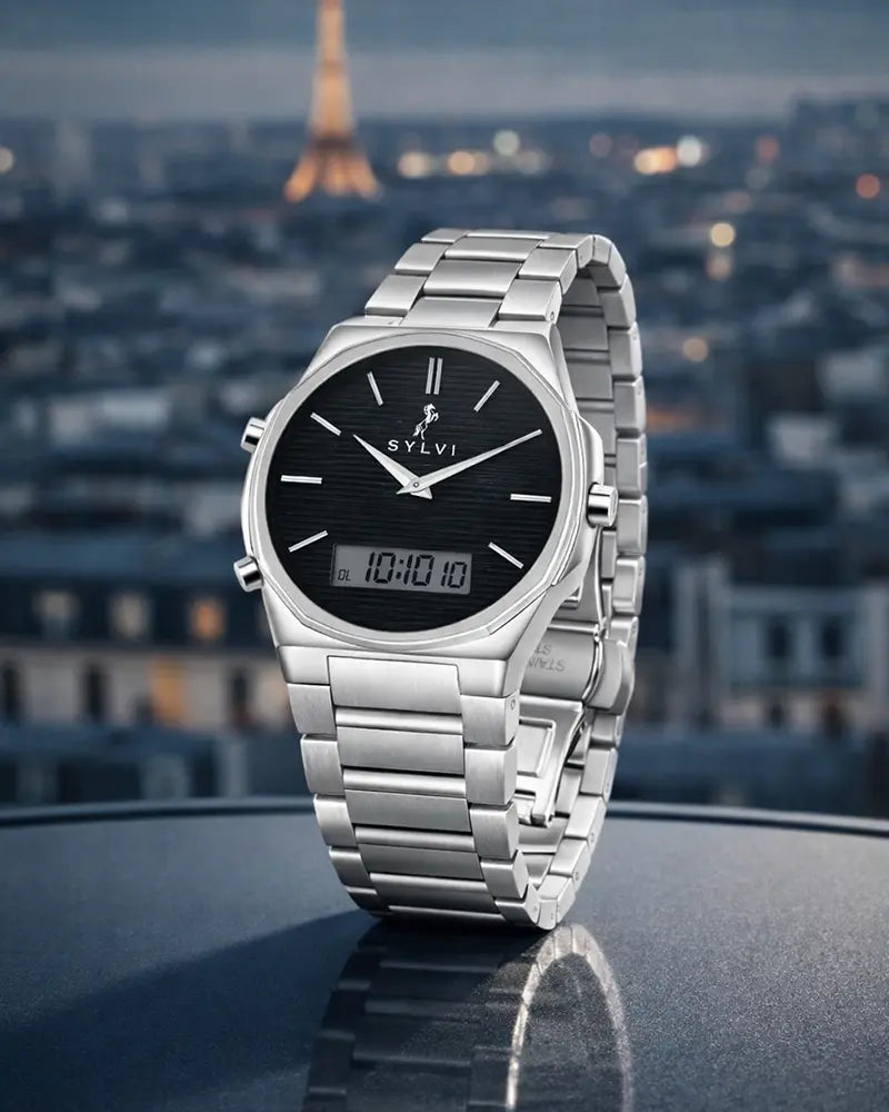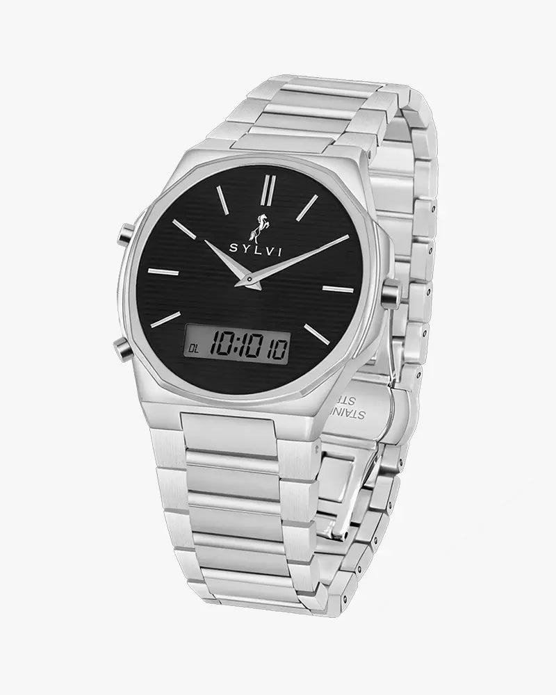 The Blade Dual Time Black Silver Steel is designed for men who prefer timeless strength with modern precision. This watch blends a classic silver finish with a contemporary dual-display experience, creating a refined everyday timepiece that feels confident, balanced, and purposeful.