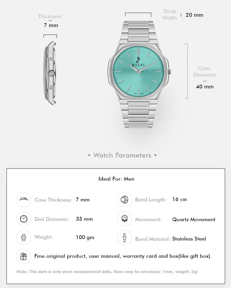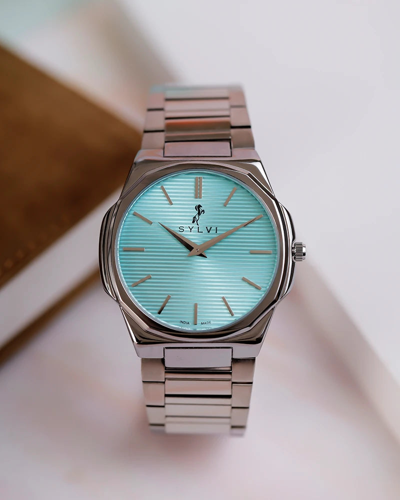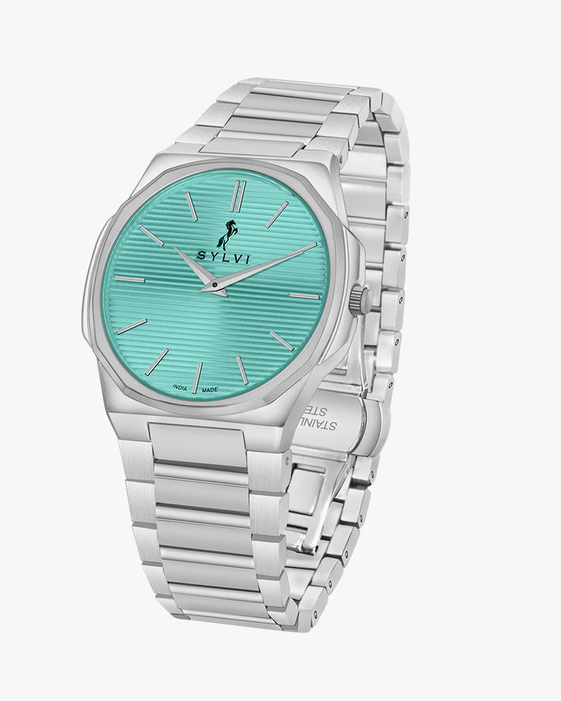 The Sylvi Blade Men's Watch combines ultra-slim elegance with precision and quality, making it a standout piece in any collection. Proudly made in India, this minimalistic watch features a distinctive octagon case that sets it apart from traditional designs. Its sleek powder blue dial is enhanced by a silver stainless steel bracelet, bringing a touch of luxury to its refined look.