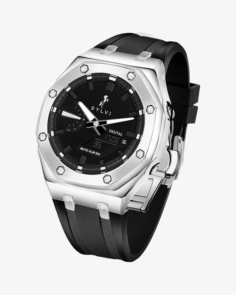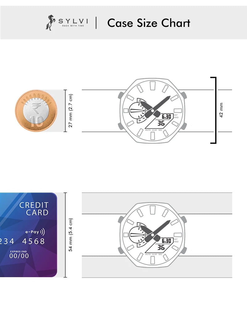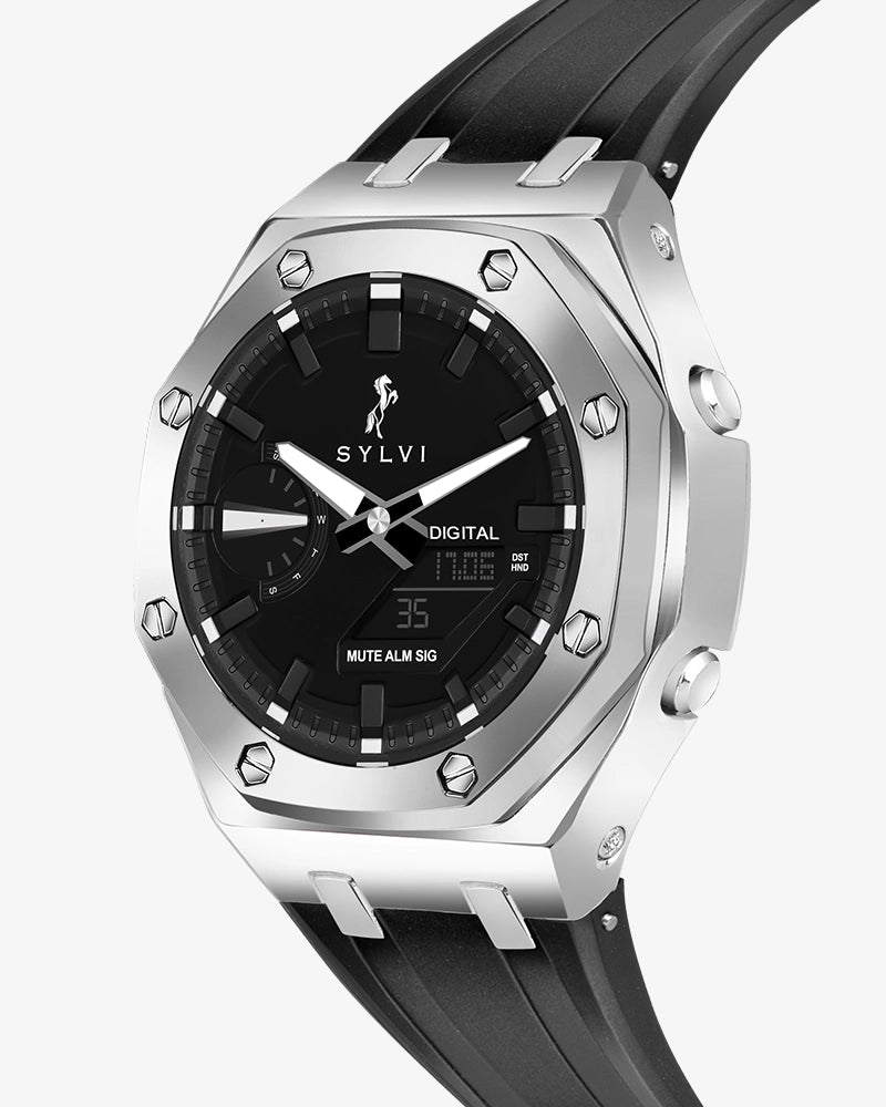 Tailored for adult men, the Sylvi Rig One 'O One WT Max Silver Analog-Digital Watch appeals to professionals, travelers, and enthusiasts who appreciate a blend of classic design and modern functionality. Its comprehensive features support an active lifestyle, while its elegant design complements both formal and casual attire. Exemplifying superior craftsmanship and precision engineering, this Make in India timepiece reflects the quality and innovation associated with the Sylvi brand.