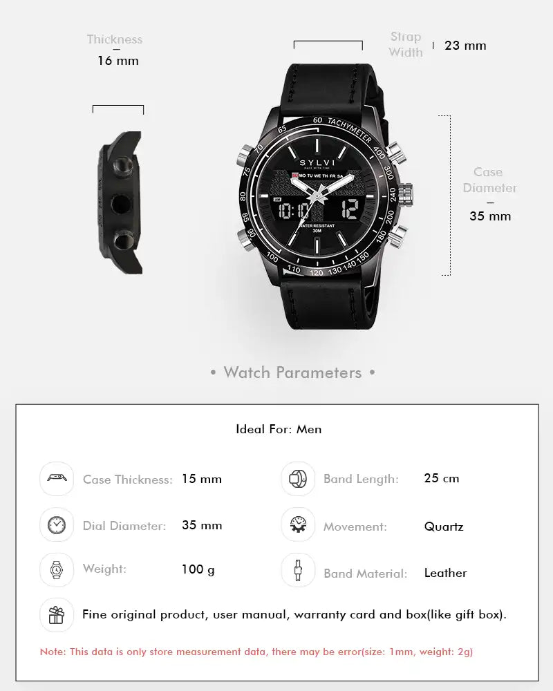 Analog and digital dual dials support two different timezones. Shock-resistant, stopwatch, military 12H/24H time, and LED backlight functions to make it perfect for all kinds of sport and daily use.