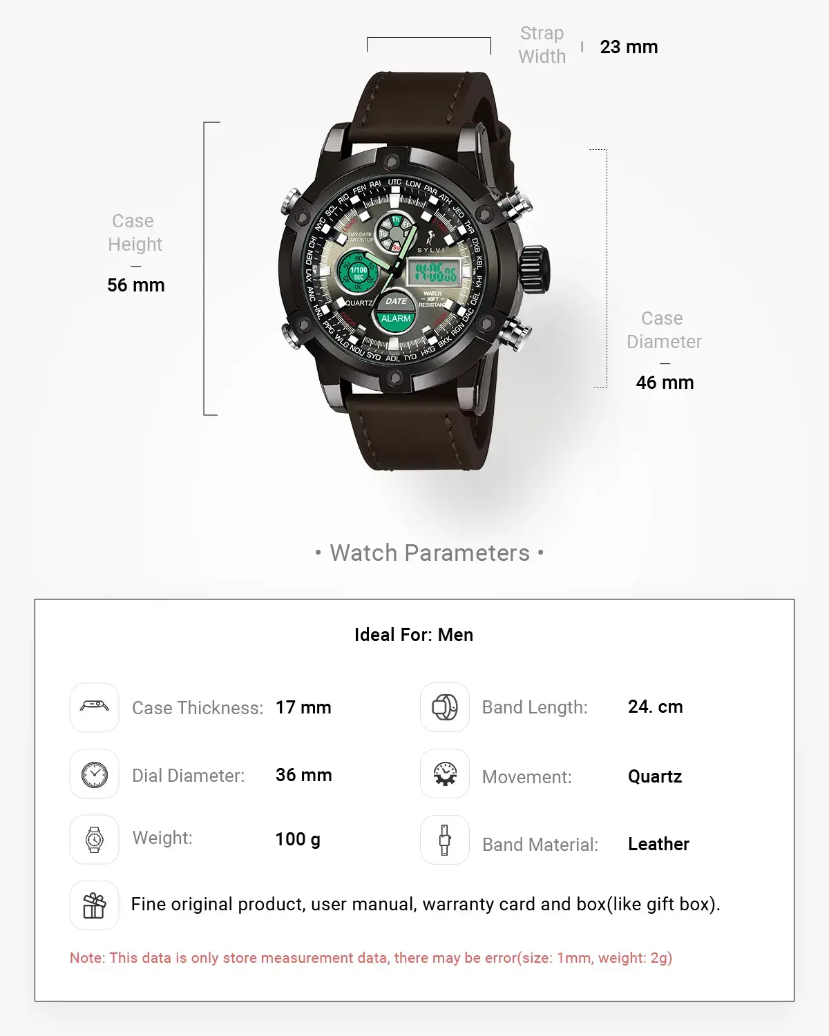 This watch is designed to seamlessly transition between professional settings and casual outings. The combination of analog and digital displays provides versatility, allowing users to access multiple time zones and features effortlessly. The genuine leather strap and robust case materials ensure that the watch withstands daily wear while maintaining its aesthetic appeal.