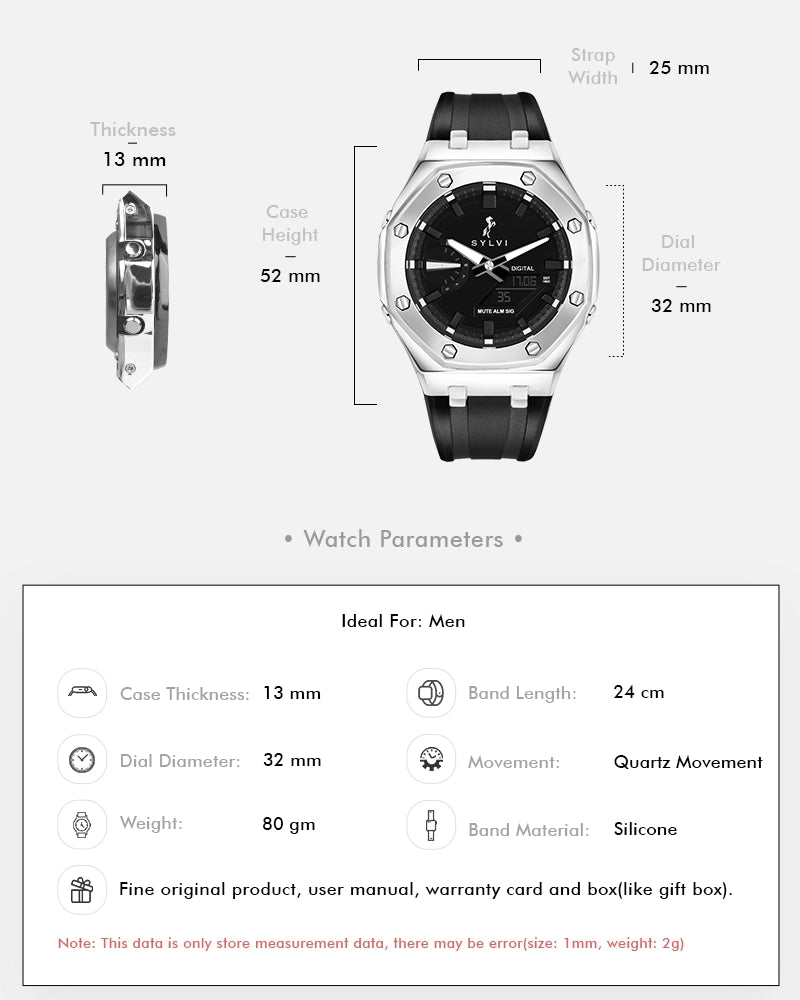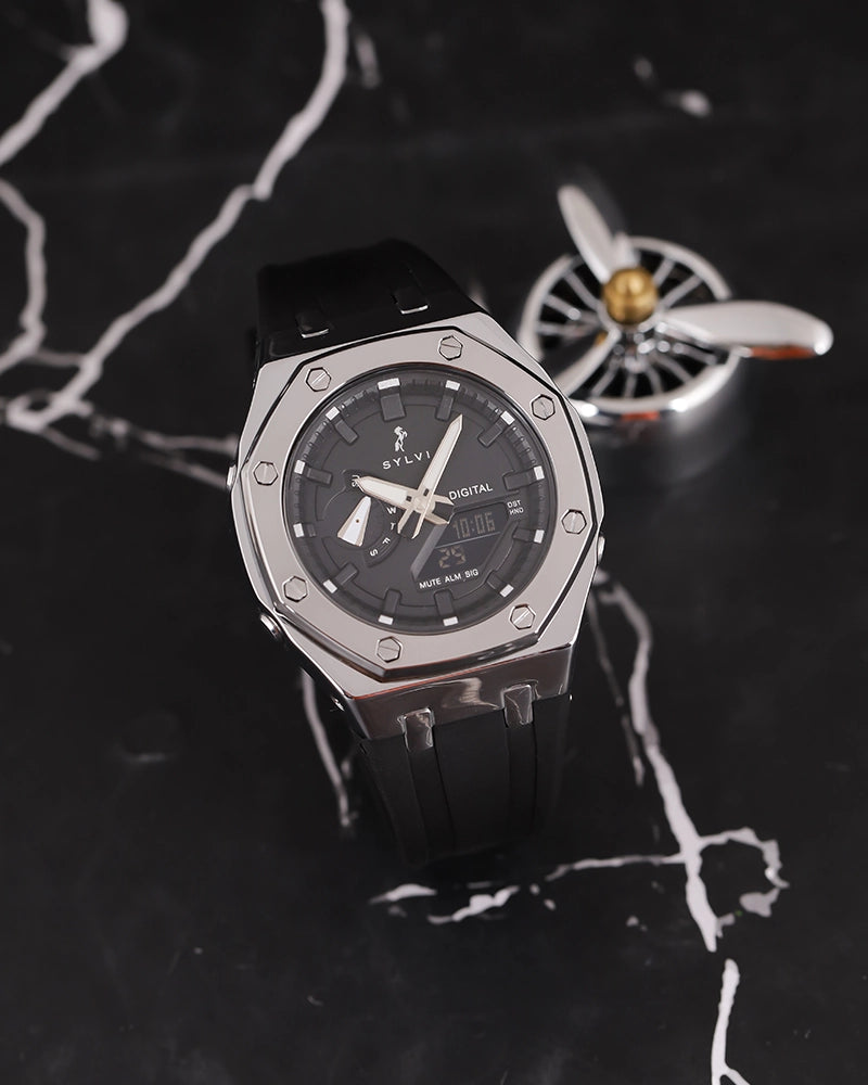 Tailored for adult men, the Sylvi Rig One 'O One WT Max Silver Analog-Digital Watch appeals to professionals, travelers, and enthusiasts who appreciate a blend of classic design and modern functionality. Its comprehensive features support an active lifestyle, while its elegant design complements both formal and casual attire. Exemplifying superior craftsmanship and precision engineering, this Make in India timepiece reflects the quality and innovation associated with the Sylvi brand.