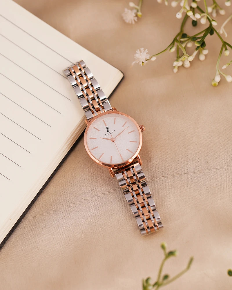 Discover the charm of sophistication with the Riva Silver Roseluxe Steel from the Sylvi Riva Collection. Designed for the modern woman, this stylish watch for women blends the beauty of a sleek stainless-steel strap with a refined analog dial, making it perfect for both everyday wear and special occasions.