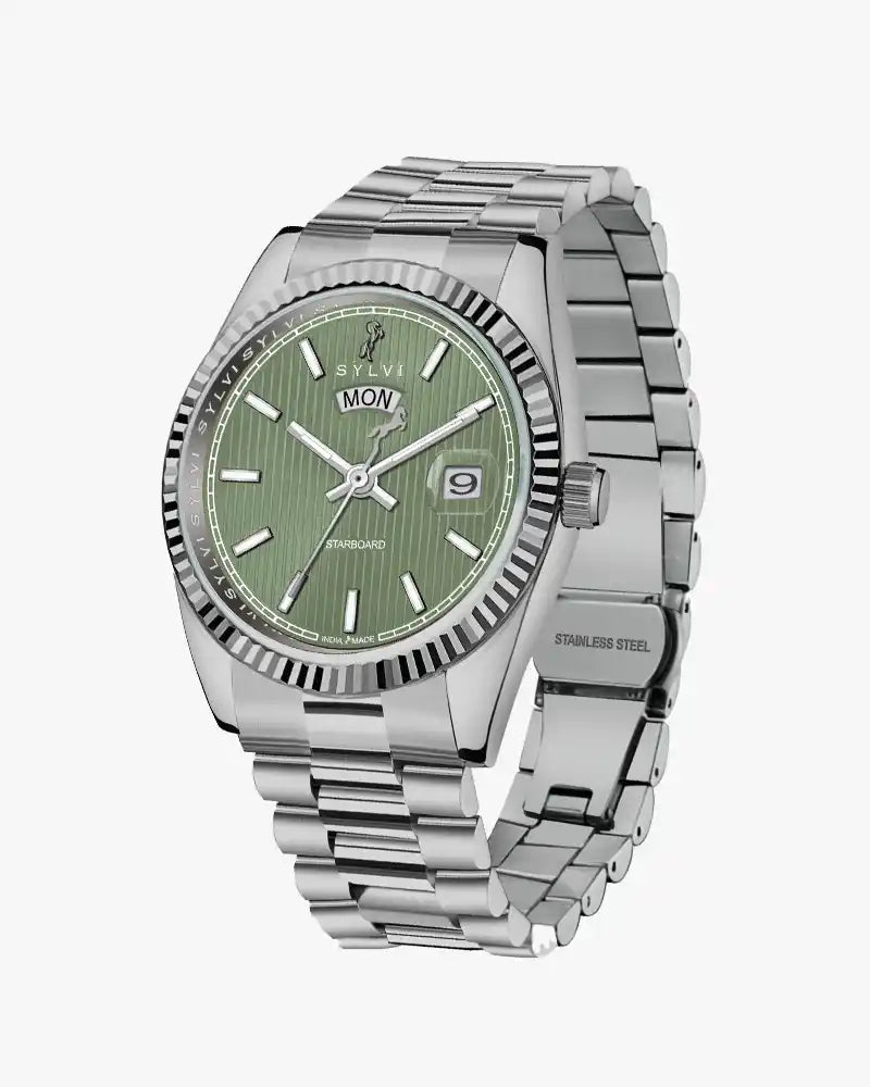 Stay organized with the day-date display and straightforward analog function. The patented fold-over clasp, equipped with a lockable adjustment system, ensures a secure and customized fit. Crafted with care in India, it's a testament to both beautiful design and Indian craftsmanship. Elevate your look with the Starboard Green Silver – where style meets simplicity.