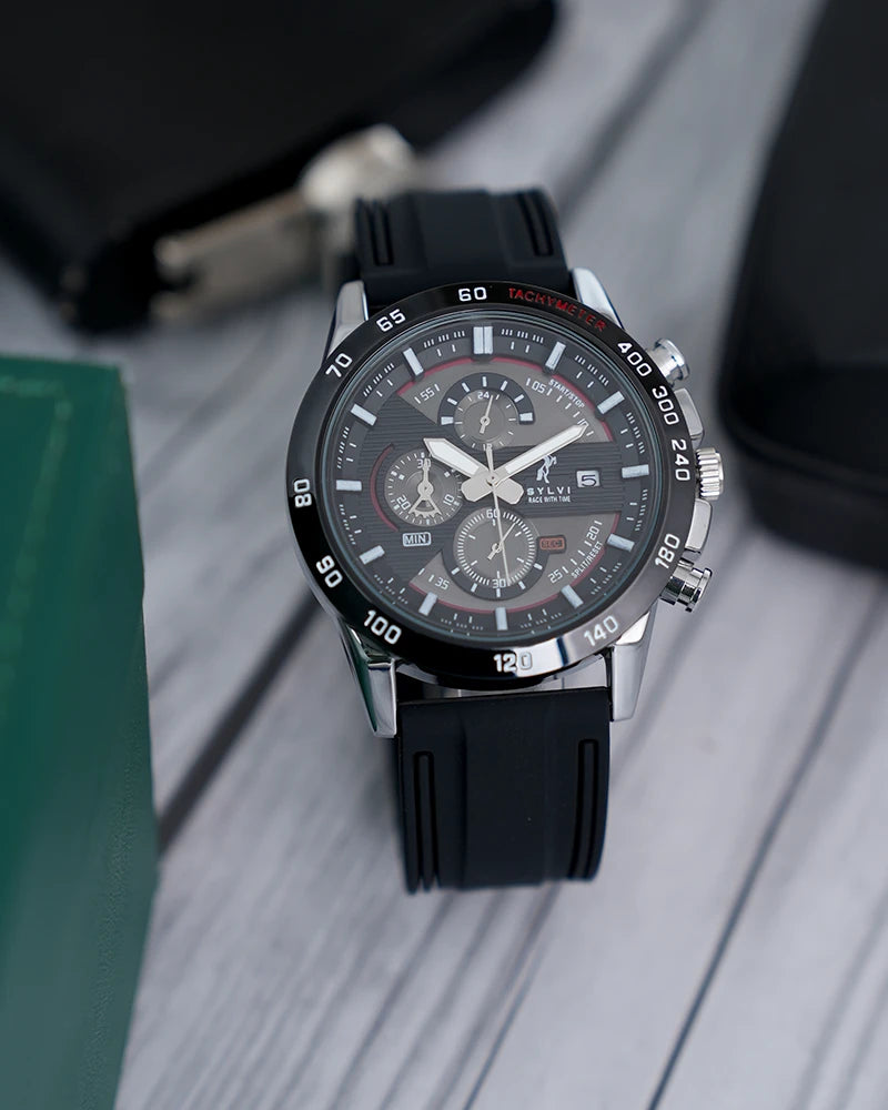 Sylvi Timegrapher Red Accent Black Silicone Strap Chronograph Watch for Men