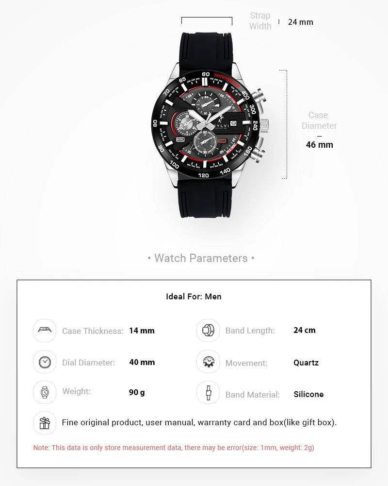Introducing the Sylvi Timegrapher Red Accent Chronograph Watch—a harmonious blend of contemporary design and reliable functionality, crafted for the modern man who values both style and performance.