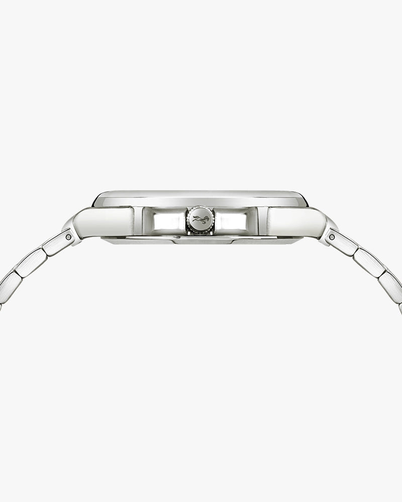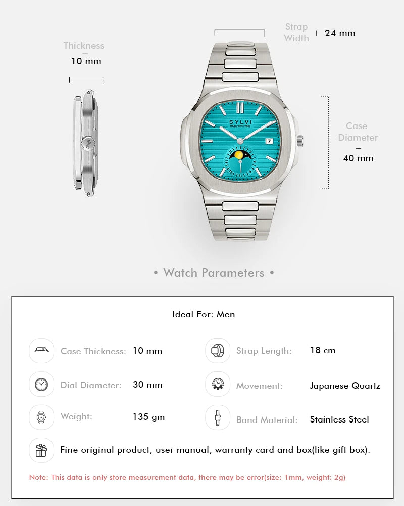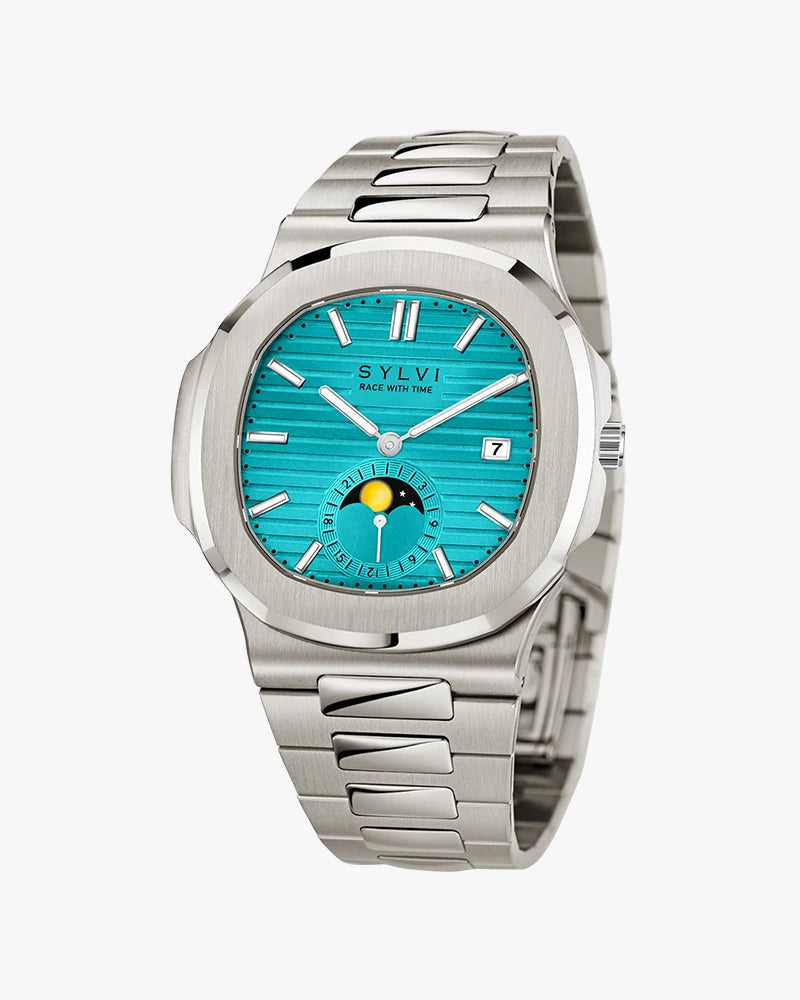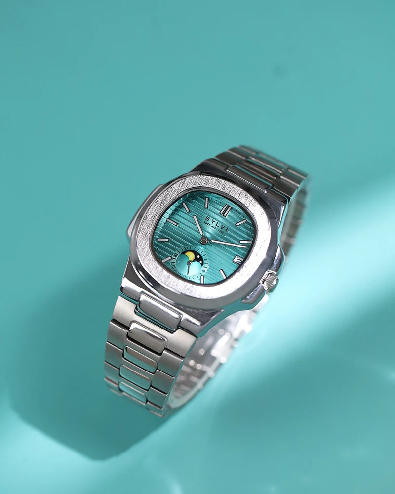 Unveiling a perfect balance of elegance and innovation, the Sylvi Urbane Moon Aqua Blue is designed for those who appreciate refined craftsmanship. The squircle-shaped analog dial, inspired by the mystique of the moon, showcases a striking aqua blue shade with silver accents, creating a bold yet sophisticated look. A built-in date display ensures practicality, keeping you effortlessly on track.