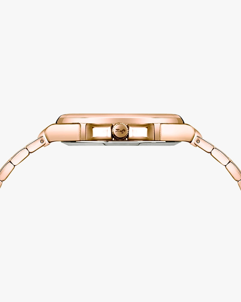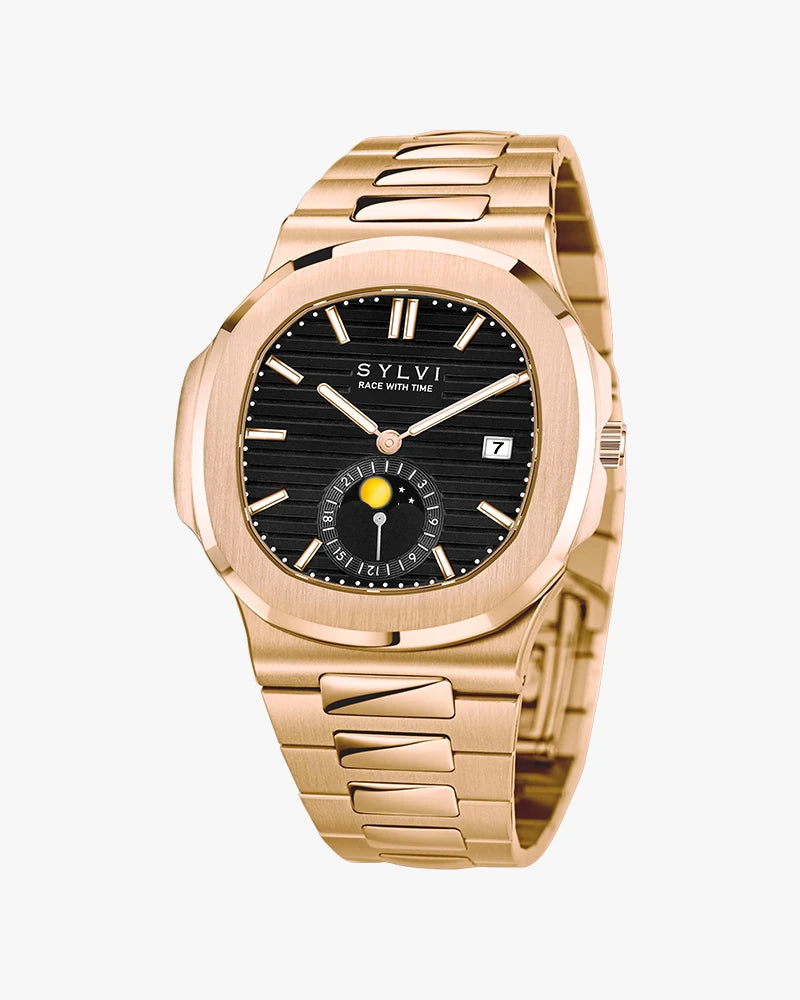 Experience a perfect blend of sophistication and celestial charm with the Sylvi Urbane Moon Rosegold. Featuring a uniquely designed squircle-shaped analog dial inspired by the moon, this timepiece showcases a refined rosegold finish with elegant detailing. The harmonious combination of style and functionality is enhanced by a date display, ensuring you stay on schedule with ease.