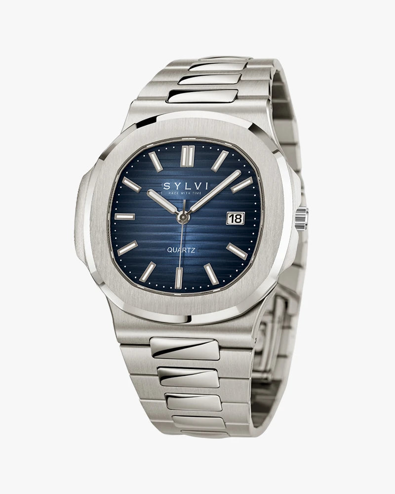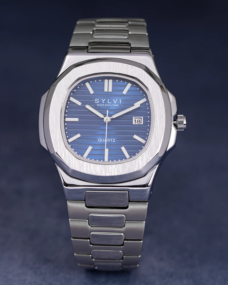 Explore the classy beauty of the Urbane Silver Blue Watch. Its captivating blue dial dances beneath a radiant silver case, perfectly complemented by a matching silver steel strap. The watch's unique octagonal shape offers a fresh take on timeless elegance. Effortlessly keep track of time with the simple analog display and always stay in the know with the integrated date function. Ensuring both style and security, our patented fold-over clasp guarantees a snug fit with its lockable adjustment system. With every glance, it's a promise of sophistication and precision.