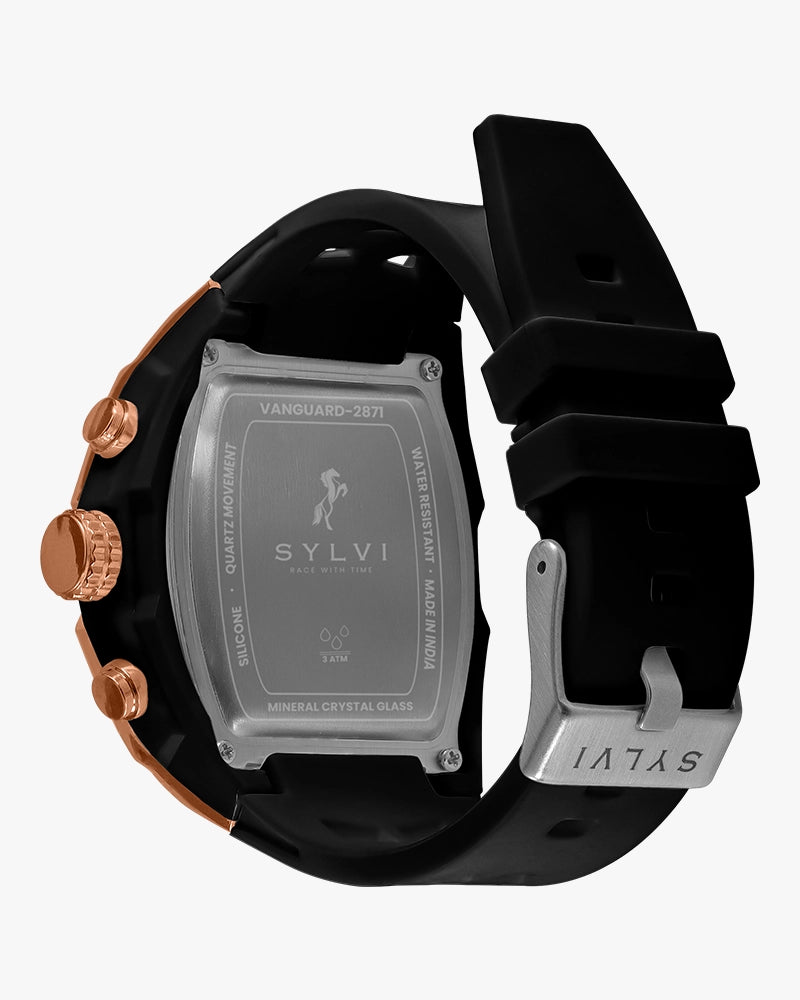 Vanguard Black Rose Gold Analog-Digital watch is a strong, accurate, and confident timepiece and an assuring ally in everyday life.