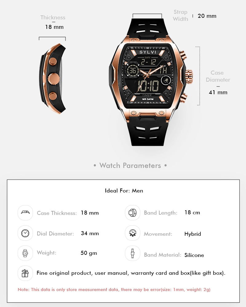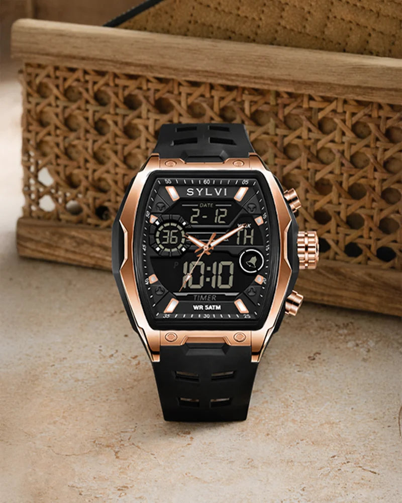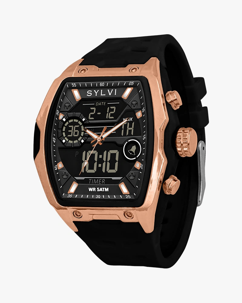 The Vanguard Black Rose Gold analog-digital watch is a watch that is crafted based on the requirements of men who treasure readability, functionality, and a bold contemporary look. The bold touches of rose gold case, black dial, and Black give a powerful and classy appearance that is noticeable on the wrist.
